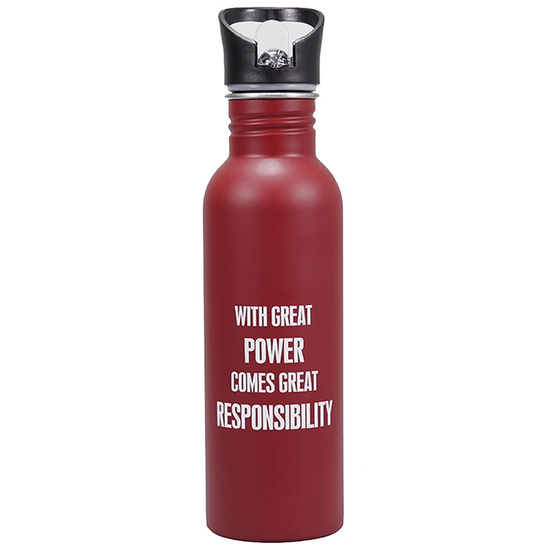 Flasche mit Aufschrift „With great power comes great responsibility“